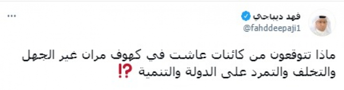 وتساءل في تغريدة على حسابه بموقع التدوين المصغر تويتر، اليوم قائلا: "ماذا تتوقعون من كائنات عاشت في كهوف مران غير الجهل والتخلف والتمرد على الدولة والتنمية؟".