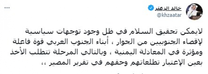 وأشار إلى أن: "أبناء الجنوب العربي قوة فاعلة ومؤثرة في المعادلة اليمنية، وبالتالي المرحلة تتطلب الأخذ بعين الاعتبار تطلعاتهم وحقهم في تقرير المصير".