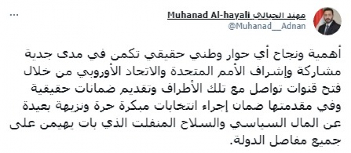 وشدد في تغريدة على حسابه بموقع التدوين المصغر تويتر، اليوم على أن: "أهمية ونجاح أي حوار وطني حقيقي تكمن في مدى جدية مشاركة وإشراف الأمم المتحدة والاتحاد الأوروبي من خلال فتح قنوات تواصل مع تلك الأطراف وتقديم ضمانات حقيقية".