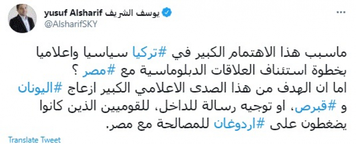 وقال في تغريدة عبر "تويتر" رصدها "المشهد العربي": "ما سبب هذا الاهتمام الكبير في تركيا سياسيا وإعلاميا بخطوة استئناف العلاقات الدبلوماسية مع مصر؟ أما أن الهدف من هذا الصدى الإعلامي الكبير إزعاج اليونان وقبرص، او توجيه رسالة للداخل، للقوميين الذين كانوا يضغطون على أردوغان للمصالحة مع مصر".