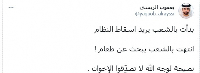 وقال في تغريدة عبر "تويتر" رصدها "المشهد العربي": "بدأت بالشعب يريد اسقاط النظام انتهت بالشعب يبحث عن طعام! نصيحة لوجه الله لا تصدِّقوا الإخوان".