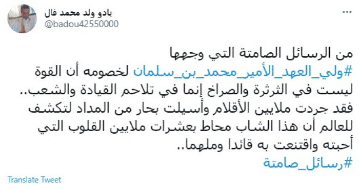 قال الكاتب الصحفي الموريتاني بادو ولد محمد فال، اليوم، إن ولي العهد السعودي الأمير محمد بن سلمان، وجه رسائل صامتة بأن تلاحم القيادة والشعب أهم من الثرثرة والصراخ.