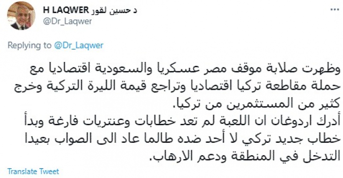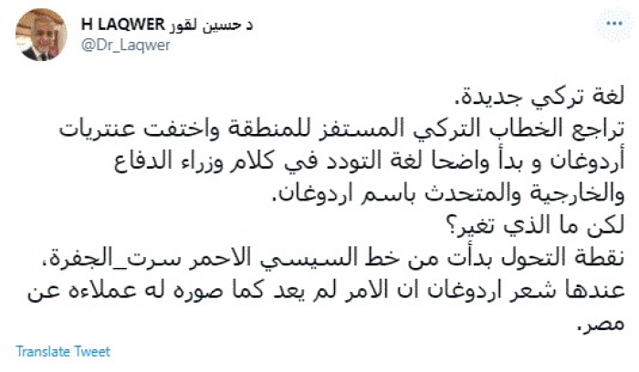 وأضاف: "نقطة التحول بدأت من خط السيسي الأحمر سرت الجفرة، عندها شعر أردوغان أن الأمر لم يعد كما صوره له عملاءه عن مصر. وظهرت صلابة موقف مصر عسكريا والسعودية اقتصاديا مع حملة مقاطعة تركيا اقتصاديا وتراجع قيمة الليرة التركية وخرج كثير من المستثمرين من تركيا".