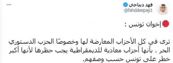 وقال في تغريدة عبر "تويتر" رصدها "المشهد العربي": "إخوان تونس.. ترى في كل الأحزاب المعارضة لها وخصوصًا الحزب الدستوري الحر، بأنها أحزاب معادية للديمقراطية يجب حظرها لأنها أكبر خطر على تونس حسب وصفهم".