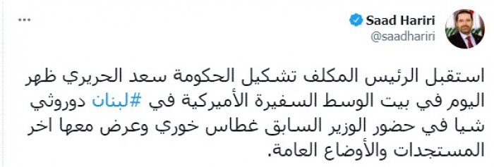 وقال في تغريدة عبر "تويتر" رصدها "المشهد العربي": "استقبل الرئيس المكلف تشكيل الحكومة سعد الحريري ظهر اليوم في بيت الوسط السفيرة الأميركية في لبنان دوروثي شيا في حضور الوزير السابق غطاس خوري وعرض معها اخر المستجدات والأوضاع العامة".