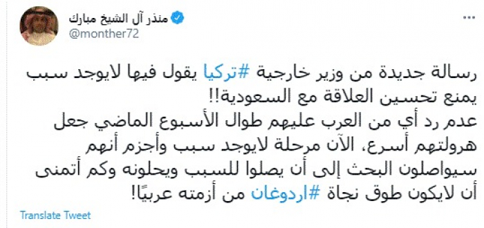 وقال في تغريدة عبر "تويتر" رصدها "المشهد العربي": "رسالة جديدة من وزير خارجية تركيا يقول فيها لا يوجد سبب يمنع تحسين العلاقة مع السعودية! عدم رد أي من العرب عليهم طوال الأسبوع الماضي جعل هرولتهم أسرع، الآن مرحلة لايوجد سبب وأجزم أنهم سيواصلون البحث إلى أن يصلوا للسبب ويحلونه وكم أتمنى أن لا يكون طوق نجاة أردوغان من أزمته عربيًا".