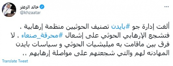 وكتب في تغريدة عبر "تويتر" رصدها "المشهد العربي": "ألغت إدارة جو بايدن تصنيف الحوثيين منظمة إرهابية، فتشجع الإرهابي الحوثي على إشعال محرقة صنعاء، لا فرق بين ما قامت به مليشيات الحوثي وسياسات بايدن المهادنة لهم والتي شجعتهم على مواصلة إرهابهم".