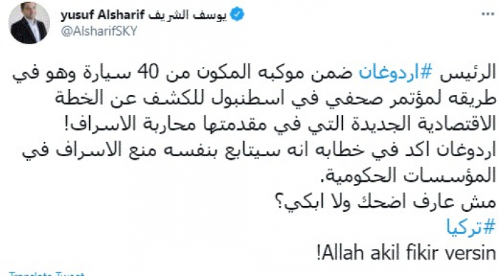 وقال في تغريدة عبر "تويتر" رصدها "المشهد العربي": "الرئيس أردوغان ضمن موكبه المكون من 40 سيارة وهو في طريقه لمؤتمر صحفي في اسطنبول للكشف عن الخطة الاقتصادية الجديدة التي في مقدمتها محاربة الإسراف! أردوغان أكد في خطابه أنه سيتابع بنفسه منع الإسراف في المؤسسات الحكومية. مش عارف اضحك ولا ابكي؟".