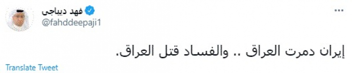 وقال في تغريدة عبر "تويتر" رصدها "المشهد العربي": "إيران دمرت العراق .. والفساد قتل العراق".