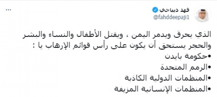وقال في تغريدة على حسابه بموقع التدوين المصغر تويتر، اليوم إن: "الذي يحرق ويدمر اليمن، ويقتل الأطفال والنساء والبشر والحجر يستحق أن يكون على رأس قوائم الإرهاب".