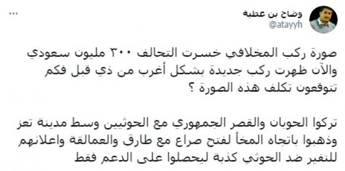 وقال في تغريدة على حسابه بموقع التدوين المصغر تويتر، اليوم إن: "صورة ركب المخلافي خسرت التحالف ٣٠٠ مليون سعودي".