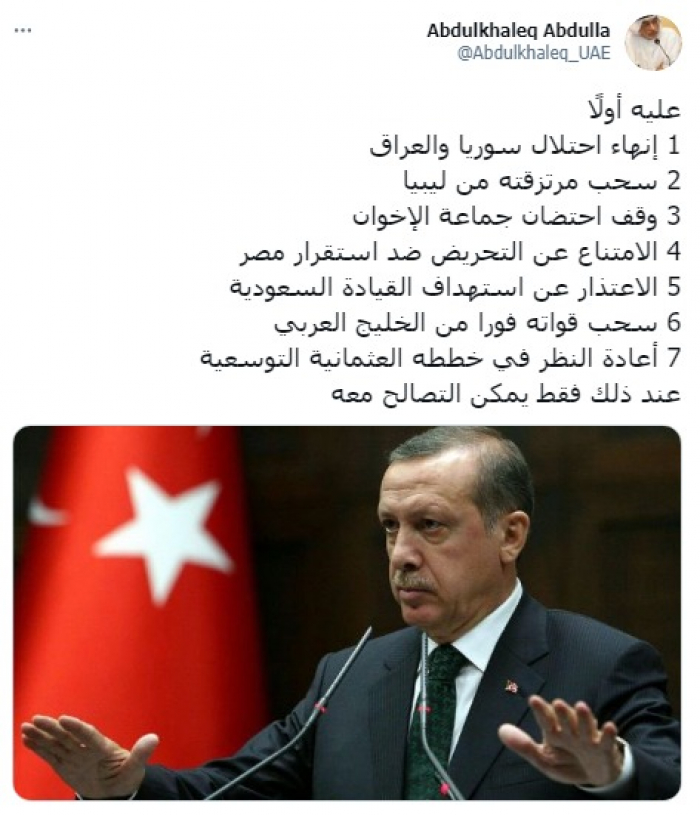 وقال في تغريدة على حسابه بموقع التدوين المصغر تويتر، اليوم إنه: "عليه أولًا 1 إنهاء احتلال سوريا والعراق، 2 سحب مرتزقته من ليبيا، 3 وقف احتضان جماعة الإخوان".