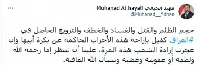 وشدد في تغريدة على حسابه بموقع التدوين المصغر تويتر، اليوم على أن: "حجم الظلم والقتل والفساد والخطف والترويع الحاصل في العراق كفيل بإزاحة هذه الأحزاب الحاكمة عن بكرة أبيها".
