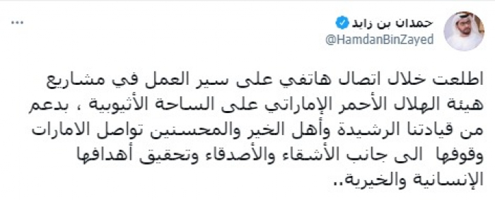 وقال في تغريدة على حسابه بموقع التدوين المصغر تويتر، اليوم إني: "اطلعت خلال اتصال هاتفي على سير العمل في مشاريع هيئة الهلال الأحمر الإماراتي على الساحة الإثيوبية".
