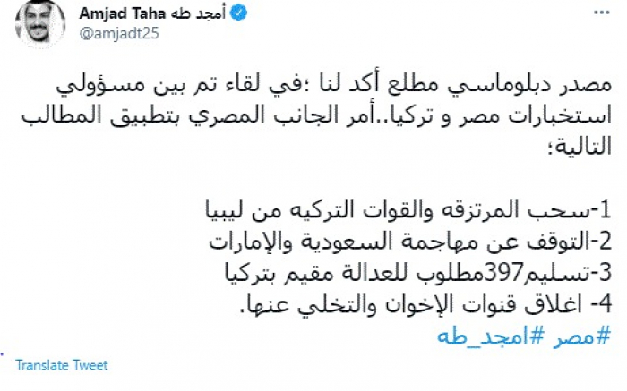 وقال في تغريدة عبر "تويتر" رصدها "المشهد العربي": "مصدر دبلوماسي مطلع أكد لنا؛ في لقاء تم بين مسؤولي استخبارات مصر و تركيا..أمر الجانب المصري بتطبيق المطالب التالية؛ سحب المرتزقة والقوات التركية من ليبيا التوقف عن مهاجمة السعودية والإمارات تسليم397مطلوب للعدالة مقيم بتركيا إغلاق قنوات الإخوان والتخلي عنها".