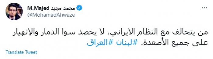 قال الكاتب الصحفي محمد مجيد الأحوازي، اليوم، إن من يتحالف مع النظام الايراني، لا يحصد سوى الدمار والانهيار على جميع الأصعدة.