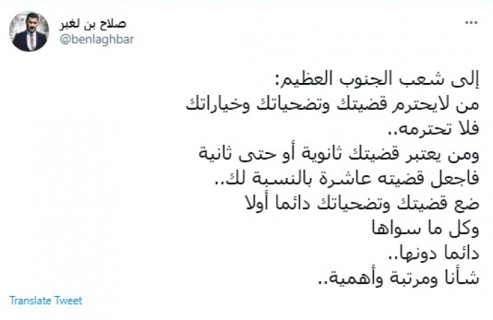 بن لغبر لـ شعب الجنوب: سنضع قضيتنا وتضحياتنا في المرتبة الأولى