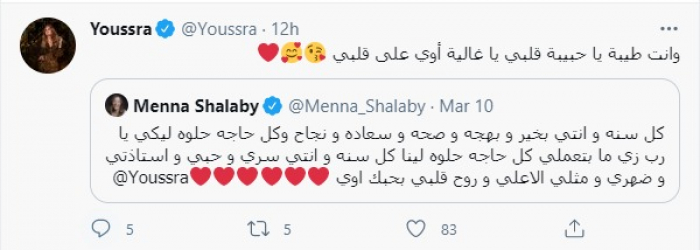 وكتبت يسرا، عبر حسابها على تويتر : "وانت طيبة يا حبيبة قلبي.. يا غالية أوي على قلبي".