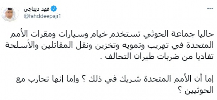 وقال في تغريدة عبر "تويتر" رصدها "المشهد العربي": "حاليًا جماعة الحوثي تستخدم خيام وسيارات ومقرات الأمم المتحدة في تهريب وتمويه وتخزين ونقل المقاتلين والأسلحة تفاديًا من ضربات طيران التحالف".