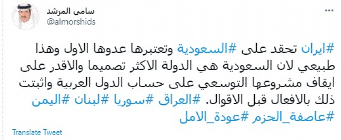 وقال في تغريدة عبر "تويتر" رصدها "المشهد العربي": "إيران تحقد على السعودية وتعتبرها عدوها الأول وهذا طبيعي لأن السعودية هي الدولة الاكثر تصميمًا والأقدر على إيقاف مشروعها التوسعي على حساب الدول العربية وأثبتت ذلك بالأفعال قبل الأقوال".