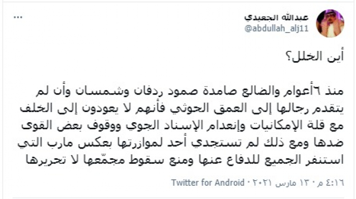 وطرح "الجعيدي" تساؤلا في تغريدة عبر تويتر، رصدها "المشهد العربي": "أين الخلل؟ منذ ٦أعوام والضالع صامدة صمود ردفان وشمسان وإن لم يتقدم رجالها إلى العمق الحوثي فإنهم لا يعودون إلى الخلف مع قلة الإمكانيات وانعدام الإسناد الجوي ووقوف بعض القوى ضدها ومع ذلك لم تستجد أحدا لمؤازرتها".