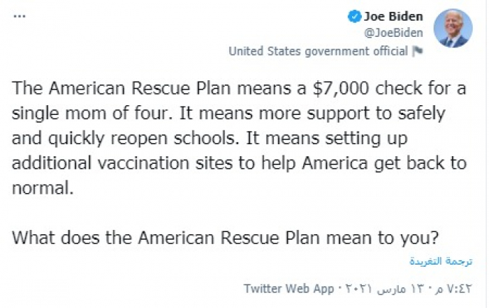 وأوضح "بايدن" في تغريدة عبر تويتر، رصدها "المشهد العربي: "تعني خطة الإنقاذ الأمريكية شيكًا بقيمة 7000 دولار لأم وحيدة لأربعة أطفال".