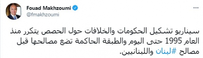 وقال في تغريدة عبر "تويتر" رصدها "المشهد العربي": "سيناريو تشكيل الحكومات والخلافات حول الحصص يتكرر منذ العام 1995 حتى اليوم والطبقة الحاكمة تضع مصالحها قبل مصالح لبنان واللبنانيين".