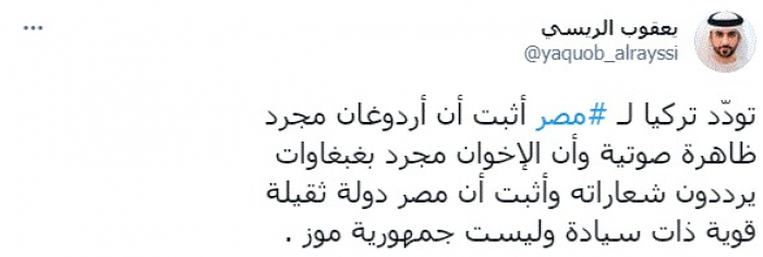 وكتب في تغريدة عبر "تويتر" رصدها "المشهد العربي": "تودّد تركيا لمصر أثبت أن أردوغان مجرد ظاهرة صوتية وأن الإخوان مجرد .... يرددون شعاراته وأثبت أن مصر دولة ثقيلة قوية ذات سيادة وليست جمهورية موز".