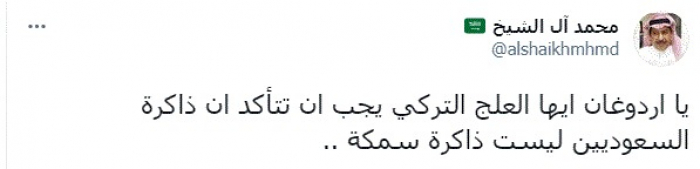 وقال في تغريدة عبر "تويتر" رصدها "المشهد العربي": "يا أردوغان أيها ... التركي يجب أن تتأكد أن ذاكرة السعوديين ليست ذاكرة سمكة".