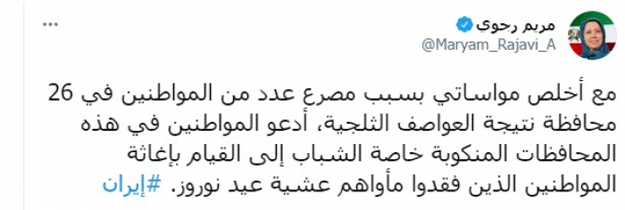 دعت زعيمة المعارضة الإيرانية مريم رجوي، اليوم، لإغاثة المنكوبين جراء العواصف الثلجية في إيران.