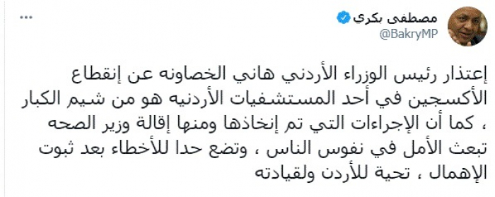 وكتب في تغريدة عبر "تويتر" رصدها "المشهد العربي": "اعتذار رئيس الوزراء الأردني هاني الخصاونه عن انقطاع الأكسجين في أحد المستشفيات الأردنية هو من شيم الكبار ، كما أن الإجراءات التي تم انخاذها ومنها إقالة وزير الصحه تبعث الأمل في نفوس الناس ، وتضع حدا للأخطاء بعد ثبوت الإهمال ، تحية للأردن ولقيادته".