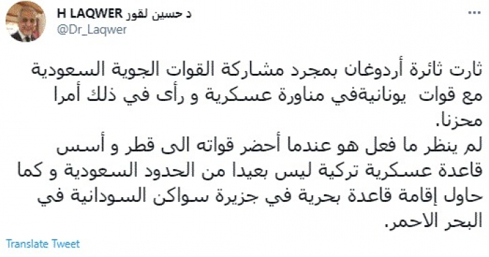 وقال في تغريدة عبر "تويتر" رصدها "المشهد العربي": "ثارت ثائرة أردوغان بمجرد مشاركة القوات الجوية السعودية مع قوات يونانية في مناورة عسكرية ورأى في ذلك أمرا محزنا".