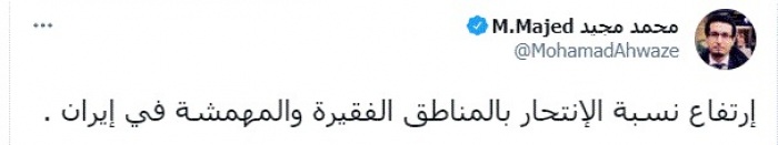 وقال في تغريد عبر "تويتر" رصدها "المشهد العربي": "ارتفاع نسبة الإنتحار بالمناطق الفقيرة والمهمشة في إيران".