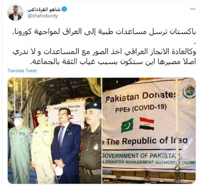 علق الكاتب الصحفي العراقي شاهو القرةداغي، اليوم، على إرسال باكستان لمساعدات طبية إلى العراق لمواجهة كورونا.