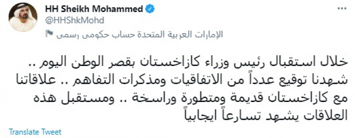 وقال في تغريدة عبر "تويتر" رصدها "المشهد العربي": "خلال استقبال رئيس وزراء كازاخستان بقصر الوطن اليوم.. شهدنا توقيع عدداً من الاتفاقيات ومذكرات التفاهم .. علاقاتنا مع كازاخستان قديمة ومتطورة وراسخة.. ومستقبل هذه العلاقات يشهد تسارعاً إيجابياً".