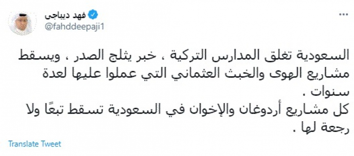 وقال في تغريدة عبر "تويتر" رصدها "المشهد العربي": "السعودية تغلق المدارس التركية، خبر يثلج الصدر، ويسقط مشاريع الهوى والخبث العثماني التي عملوا عليها لعدة سنوات".