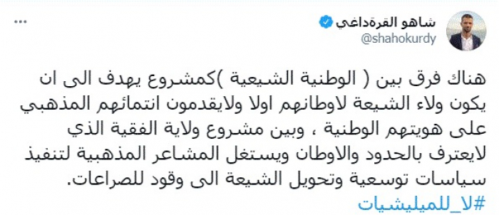 وقال في تغريدة عبر "تويتر" رصدها "المشهد العربي": "هناك فرق بين ( الوطنية الشيعية) كمشروع يهدف إلى أن يكون ولاء الشيعة لاوطانهم اولا ولايقدمون انتمائهم المذهبي على هويتهم الوطنية ، وبين مشروع ولاية الفقية الذي لايعترف بالحدود والأوطان ويستغل المشاعر المذهبية لتنفيذ سياسات توسعية وتحويل الشيعة الى وقود للصراعات".