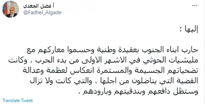 وكتب في تغريدة عبر "تويتر" رصدها "المشهد العربي": "حارب أبناء الجنوب بعقيدة وطنية وحسموا معاركهم مع مليشيات الحوثي في الأشهر الأولى من بدء الحرب ، وكانت تضحياتهم الجسيمة والمستمرة انعكاس لعظمة وعدالة القضية التي يناضلون من أجلها، والتي كانت ولا تزال وستظل دافعهم وبندقيتهم وبارودهم".