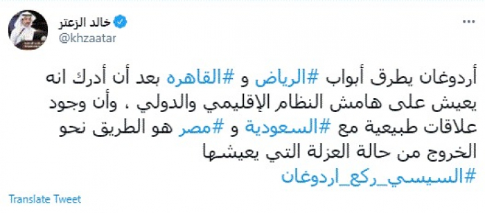 وكتب في تغريدة عبر "تويتر" رصدها "المشهد العربي": "أردوغان يطرق أبواب الرياض والقاهرة بعد أن أدرك أنه يعيش على هامش النظام الإقليمي والدولي، وأن وجود علاقات طبيعية مع السعودية ومصر هو الطريق نحو الخروج من حالة العزلة التي يعيشها".