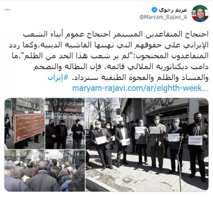 وأشارت في تغريدة على حسابها بموقع التدوين المصغر تويتر، اليوم إلى أن: "احتجاج المتقاعدين المستمر، احتجاج عموم أبناء الشعب الإيراني على حقوقهم التي نهبتها الفاشية الدينية".