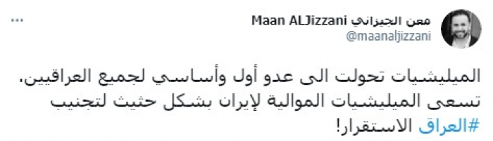 وشدد في تغريدة على حسابه بموقع التدوين المصغر تويتر، اليوم على أن: "الميليشيات تحولت إلى عدو أول وأساسي لجميع العراقيين".