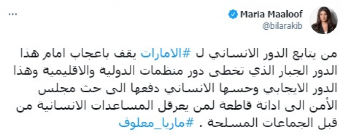 أشادت الإعلامية ماريا معلوف بدور دولة الإمارات العربية المتحدة في المجال الإنساني، مؤكدة أنه تجاوز جهود المنظمات الدولية والإقليمية.