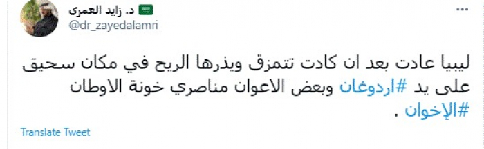 وقال في تغريدة عبر "تويتر" رصدها "المشهد العربي": "ليبيا عادت بعد أن كادت تتمزق ويذرها الريح في مكان سحيق على يد أردوغان وبعض الأعوان مناصري خونة الأوطان الإخوان".