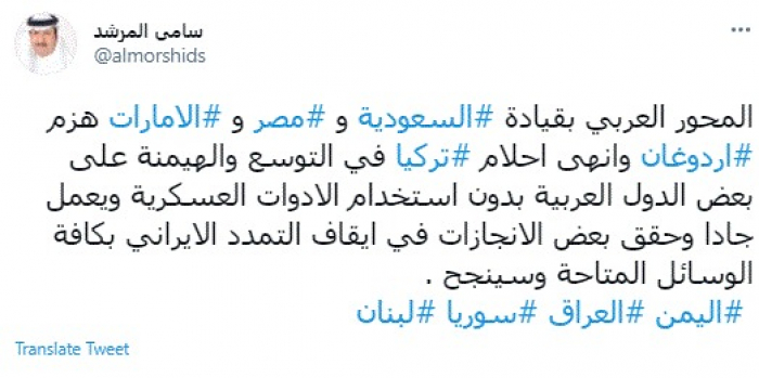 وكتب في تغريدة عبر "تويتر" رصدها "المشهد العربي": "المحور العربي بقيادة السعودية ومصر والإمارات هزم أردوغان وأنهى أحلام تركيا في التوسع والهيمنة على بعض الدول العربية بدون استخدام الأدوات العسكرية ويعمل جادا وحقق بعض الإنجازات في إيقاف التمدد الإيراني بكافة الوسائل المتاحة وسينجح".