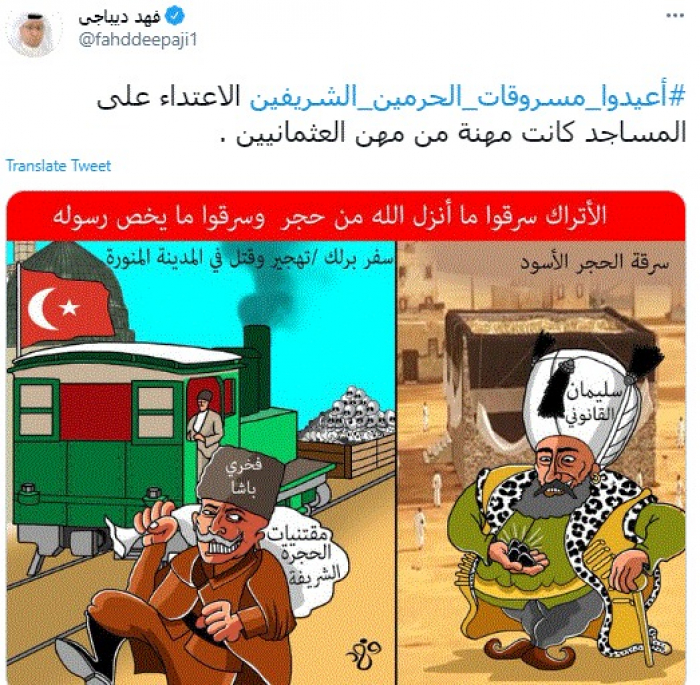 وكتب في تغريدة عبر "تويتر" رصدها "المشهد العربي": أعيدوا مسروقات الحرمين الشريفين الاعتداء على المساجد كانت مهنة من مهن العثمانيين".