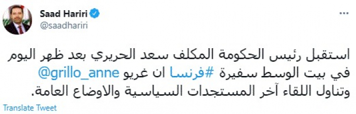 وقال في تغريدة عبر "تويتر" رصدها "المشهد العربي": "استقبل رئيس الحكومة المكلف سعد الحريري بعد ظهر اليوم في بيت الوسط سفيرة فرنسا ان غريو وتناول اللقاء آخر المستجدات السياسية والأوضاع العامة".