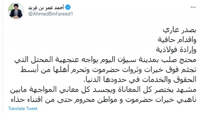 وقال في تغريدة عبر "تويتر" رصدها "المشهد العربي": "بصدر عاري وأقدام حافية وإرادة فولاذية محتج صلب بمدينة سيؤن اليوم يواجه عنجهية المحتل التي تجثم فوق خيرات وثروات حضرموت وتحرم أهلها من أبسط الحقوق والخدمات في حدودها الدنيا".