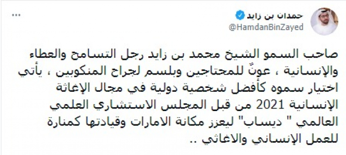وأضاف أنه: "يأتي اختيار سموه كأفضل شخصية دولية في مجال الإغاثة الإنسانية 2021 من قبل المجلس الاستشاري العلمي العالمي (ديساب) ليعزز مكانة الإمارات وقيادتها كمنارة للعمل الإنساني والإغاثي".