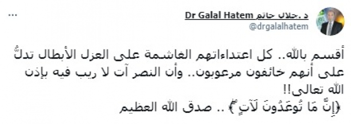 وأضاف: "أن النصر آت لا ريب فيه بإذن الله تعالى!!"، مختتما بالآية القرآنية: "﴿إِنَّ مَا تُوعَدُونَ لَآتٍ ۖ﴾ .. صدق الله العظيم".