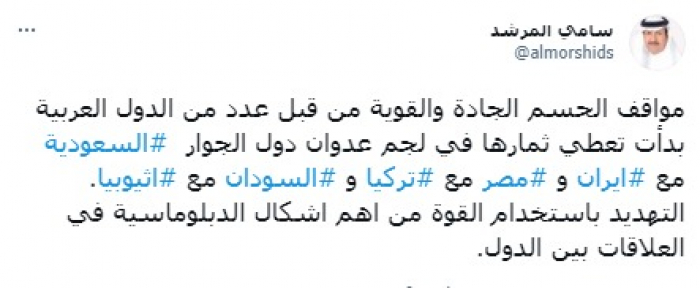 وأشار في تغريدة على حسابه بموقع التدوين المصغر تويتر، اليوم إلى أن: "مواقف الحسم الجادة والقوية من قبل عدد من الدول العربية بدأت تعطي ثمارها في لجم عدوان دول الجوار السعودية مع إيران ومصر مع تركيا، والسودان مع إثيوبيا".